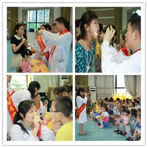 “手拿花花杯,喝口清清水,抬起头,闭着嘴,咕噜咕噜吐出水。。。。”福州市鳌峰幼儿园多功能厅里传来悦耳的漱口歌。5月28日下午,福建医科大学附属口腔医院交通路门诊部的医护人