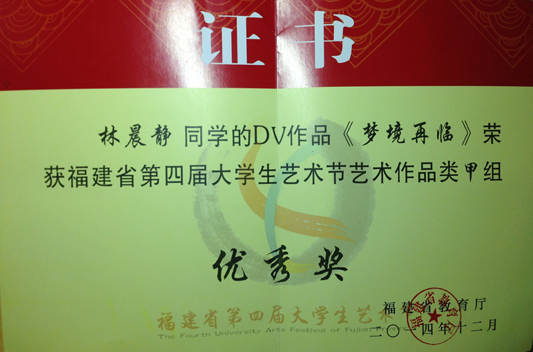 日前,福建省教育厅公布了全省第四届大学生艺术节各项目获奖名单,我院2012级林晨静同学的DV作品《梦境再临》荣获福建省第四届大学生艺术节艺术作品类甲组优秀奖。《梦境再临》