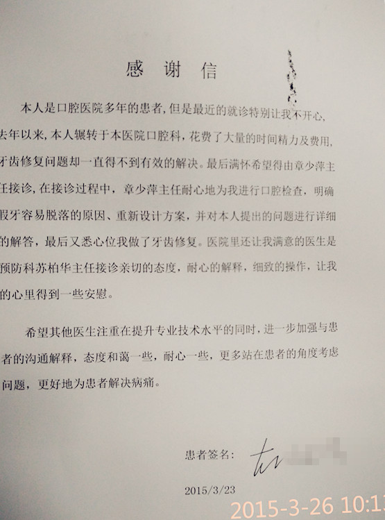 患者胡某系退休的医务工作者,在口腔医院就诊多年,是我院的老患者,对我院甚是信任。最近该患者因某些原因在就诊时有一些不愉快的经历,后经过章少萍主任接诊,为患者细心检查、