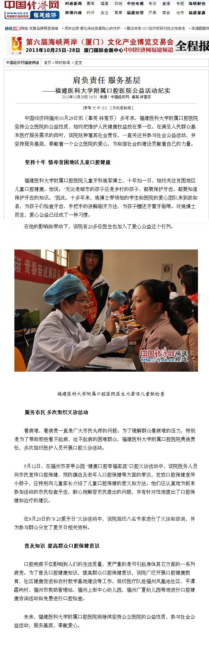 近日,中国经济网刊登了题为《肩负责任 服务基层——福建医科大学附属口腔医院公益活动纪实》的文章,记录了我院在满足人民群众基本医疗服务需求的同时,延伸着我们