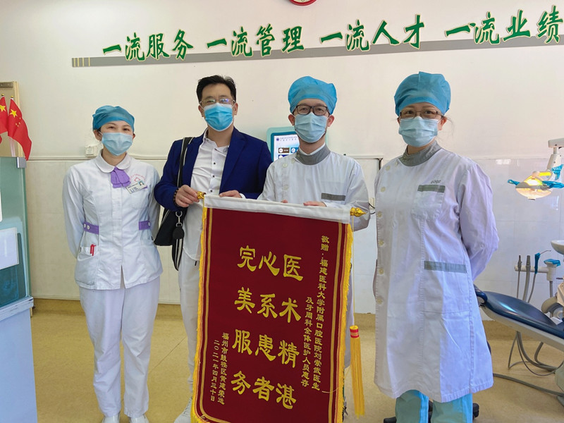 5月6日,患者黄某在结束牙周维护治疗后,将一面感谢锦旗递给刘崇武副主任,表达了对刘崇武副主任及牙周科全体医护人员的感谢。