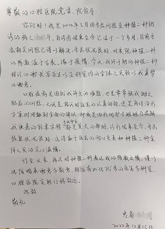 近日,我院种植二科收到患者感谢信一封。患者长期受牙病困扰,在就诊过程中,谢长富医生以及科室医护人员认真细致的诊疗态度以及周到全面的方案制定,让患者深受感动。诊疗结束,患者特发来感谢信一封,对我科医护团队的细心服务表示感谢。(种植二科鄢明东)