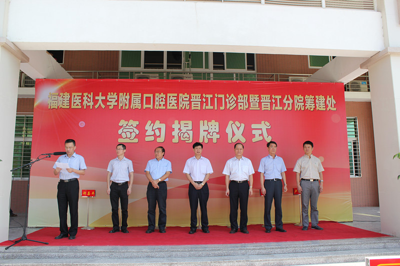 9月6日,福建医科大学附属口腔医院晋江门诊部暨晋江分院筹建处签约揭牌仪式在晋江市梅岭街道社区卫生服务中心门诊广场隆重举行。福建医科大学林建华副校长,附属口腔医院陈江院长、卢友光书记,晋江市政府刘文儒市长、曾献礼副市长、晋江市卫生局许嘉丰局长及市政府相关部门负责人出席了签约揭牌仪式。