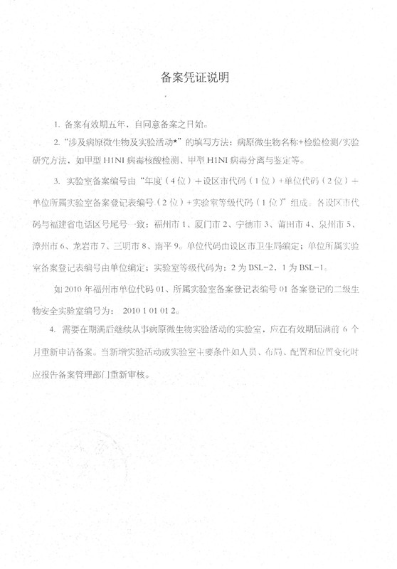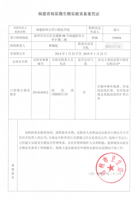 口腔医学研究中心按照之前BSL-2实验室验收专家的评审意见,完善了相关实验设备的采购和安装工作,并整理好资料于上周提交福州市卫生局审核。今天(1月26日)接到福州市卫生局正式通知:口腔医学研究中心微生物实验室成功取得了BSL-2备案凭证。至此,我中心口腔微生物实验室的生物安全管理工作进入了法制化、科学化和规范化的轨道,能够更为有效地保护实验室人员和公众的健康。此外,今后我院涉及到微生物或人工重组病毒研究课题或成果均可凭BSL-2/P2备案凭证通过该项形式审查。