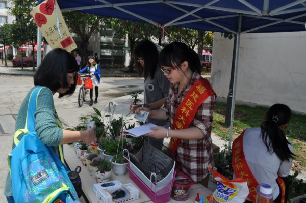 6.“献己爱”----花开医大。3月29日,学院“1+1”爱心社的13名青年志愿者在福建医科大学生活区西区食堂楼下开展爱心超市活动。活动中,志愿者们热情地向路过的同学宣传口腔医学院“1+1”爱心社及爱心超市活动的目的,爱心超市的文具,日常用品及盆栽雨鞋等吸引了很多同学。虽然在雷锋月的最后几天,但只要有志愿精神,任何时候都可以践行雷锋精神!