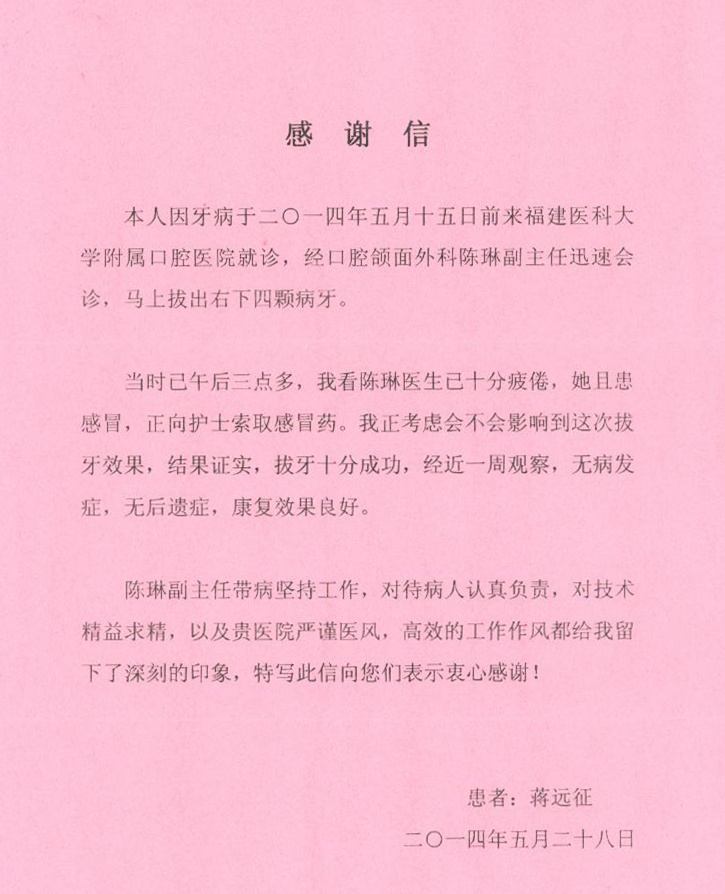 2014年5月29日,颌面外科收到患者感谢信一封。患者蒋远征于2014年5月15日就诊于颌面外科门诊,陈琳副主任医师以其精湛的技术为患者顺利拔除患牙,术后病人康复良好。病人得知陈琳副主任医师带病坚持工作,颇为感动。5月29日患者复诊时特带来此感谢信,衷心感谢陈琳副主任医师认真负责的工作态度及精益求精的严谨医风!