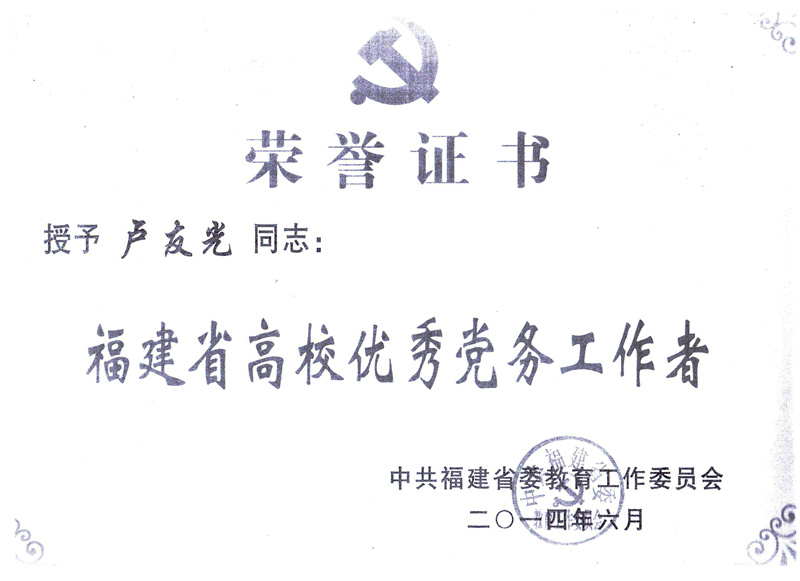 在中国共产党成立93周年前夕,福建医科大学口腔医学院、附属口腔医院党委书记卢友光教授被中共福建省委教育工作委员会授予“福建省高校优秀党务工作者”荣誉称号。(宣传科 罗博文供稿)