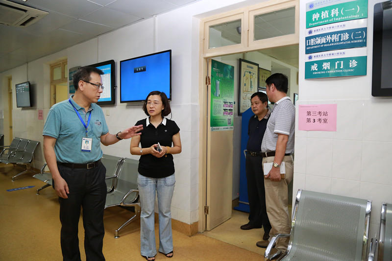 2016年7月9日,福建省卫生计生人才服务与对外交流合作中心李副主任一行莅临我院检查督导2016年国家医师资格考试实践技能考试(口腔类别)福建考区考试情况。首席考官陈江教授、总考官程辉教授分别就今年医师资格考试的基本情况,考场分布、考生安排及考试流程等分别进行了汇报,并陪同李副主任一行依次来到第一、第二及第三考站进行现场检查督导。督导过程中,李副主任对我院全院停诊两天以保障考试顺利进行的方案表示了赞赏,该方案不仅节省了时间,最大程度的减少了对患者就诊的影响,也不影响考官、考生们的正常工作学习,值得在今后的考试中延续。同时,李副主任对我院认真积极的前期准备,尤其是应对台风的应急预案以及热情周到的现场服务做出了肯定,并对我院的基地建设工作提出了宝贵意见,就下一步工作进行了指导。(科教科王善之供稿)