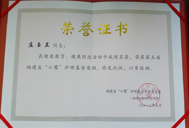 我院共派出6名护理代表参加庆祝活动,庄玉兰同志荣获福建省“小鹰护理”基金的奖励。(护理部 庄玉兰供稿)