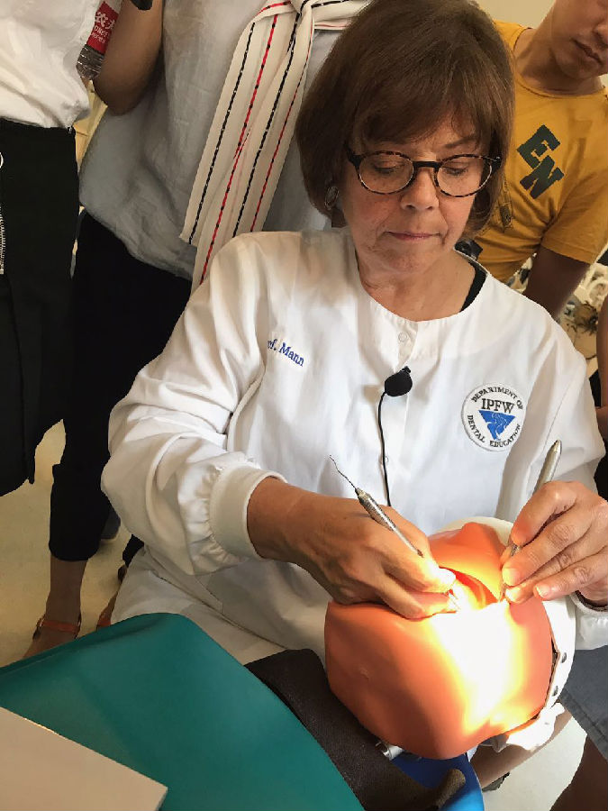 课程分为两个环节,第一环节由Nancy 教授详细讲解NSPT 的相关定义,牙周病的主要病因 、诊断、治疗方案的制定,器械的使用原则,手动刮治器的理论知识及操作。第二环节是Nancy教授在头模上进行器械的操作教学。