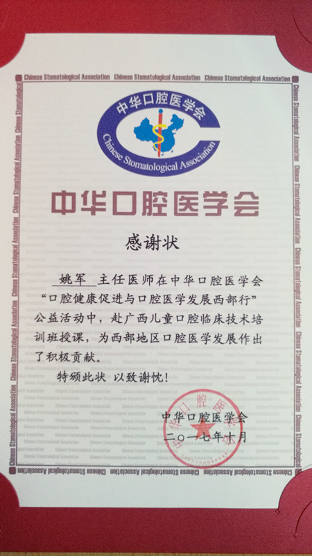 2017年10月13至14日,应中华口腔医学会的邀请,我院儿童牙科姚军主任参加了中华口腔医学会在广西壮族自治区北海市举办的“西部行”公益活动,负责广西北海市儿童口腔临床技术培训班的授课工作。这次培训还邀请了空军医科大学口腔医学院、华西口腔医学院、首都医科大学附属北京口腔医院的知名专科主任。在此次培训班上,姚军主任与学员们分享了自己在儿童口腔临床技术方面的一些经验与知识,为西部地区医学发展做出了积极贡献。(儿童牙科 黄月英供稿)