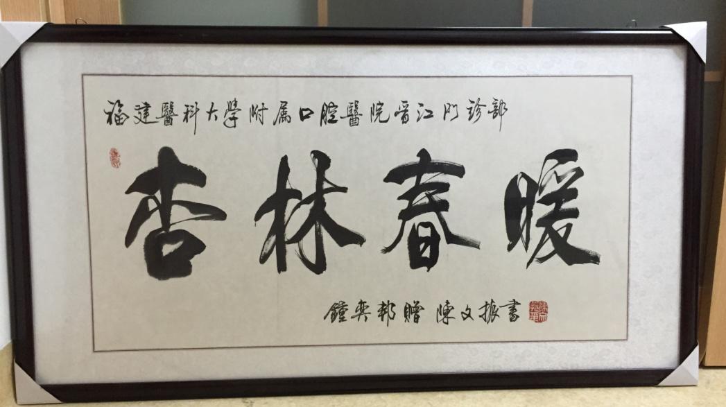 患者钟某,如今已年逾九旬,是晋江门诊部开诊以来的忠实粉丝。2年前,钟某因口内多颗牙疼痛、松动、牙列缺损就诊于晋江市某医院口腔科,后因治疗效果不佳、严重影响进食而转诊我门诊部。我门诊部团队结合其病情认真制定治疗方案、协作诊疗,历时一年多,钟某终于可以恢复正常进食,对治疗效果十分满意。近日,钟某怀着万分感激的心情,赠予我科一份沉甸甸的礼物——感谢牌匾。牌匾中“杏林春暖”四个刚劲有力的大字,不仅表达了其对晋江门诊部全体医护人员精湛医疗技术和热情服务态度的感谢和敬佩,更迸发着医患同心战胜疾病的信心和力量。(晋江门诊部 钟萍萍 胡小艳供稿)