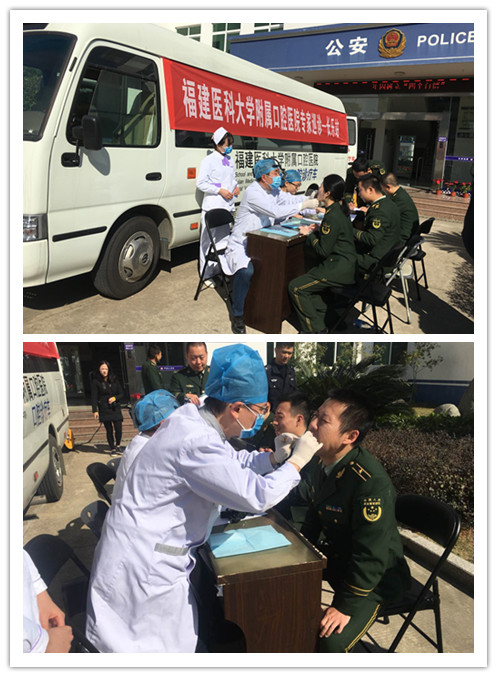 2018年1月10日,福建医科大学附属口腔医院诊疗车的“首航”正式开启。上午八时许,张志兴副院长带领医院专家团队及青年医护志愿者,不畏严冬,驱车近2小时赶赴海防前线——福州边防支队潭头边防派出所。各位专家及志愿者到达目的地后便立即投入工作:一部分专家在诊疗车外为干警们进行细致的口腔检查,就其牙周、智齿、修复等问题进行详细解答并为他们进行 “口腔健康档案”的登记。诊疗车内的专家负责为他们进行简单的治疗和处理。诊疗车内的环境干净整洁,设备齐全,接受义诊的干警官兵表示“如此高端的诊疗设备非常便利,接受诊疗也很舒适”。在活动最后,陈帅医师还为干警们进行了“龋病是什么及如何预防”的健康宣教,并现场教授了正确的刷牙方法。