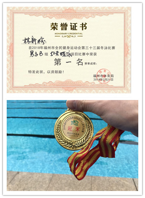 2018年2月21日,福州市体育局举办了福州市全民健身运动会第三十三届冬泳比赛,我院综合急诊科林新榕副主任医师在不影响日常诊疗工作的情况下,利用业余时间,积极参加比赛。经过激烈的比拼,获得男子组50米蝶泳冠军。本次参赛不仅弘扬了体育精神,体现了体育人文风采,更展示我口院人奋发向上的青春风采。(综合急诊科 罗宇迪供稿)
