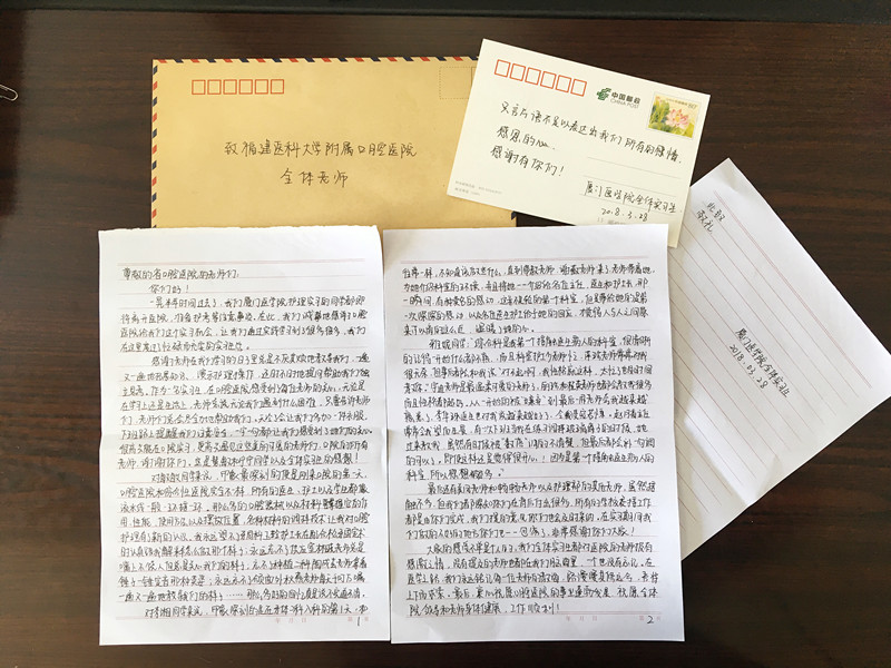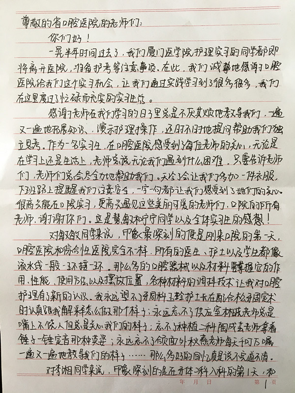 交流会后六位实习生呈上一封情真意切的感谢信!六个月的时光虽然短暂,但字里行间流露出她们的不舍,以及对口腔医院的感恩之情与美好的祝愿!(护理部谢畅畅 供稿)