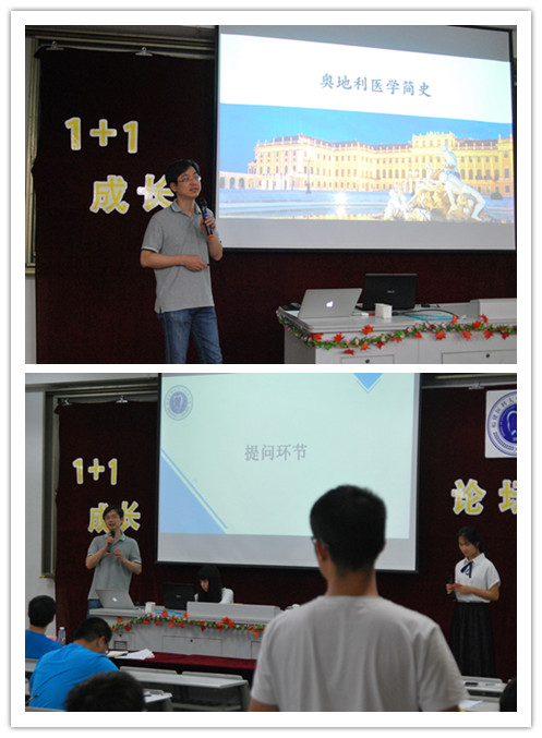 此次论坛以“博学笃志,明德求真”为主题,邀请到福建医科大学附属第一医院口腔颌面外科施斌老师担任主讲嘉宾。活动伊始,施斌老师结合自身在奥地利求学的经历,向在场师生介绍了奥地利医学的起源、医疗环境设施、医学人才培养模式,让在场的师生领略了医学的博大精深,感受了医学发展的艰辛历程。同时,他也就中西方医学的不同之处做了详细的解析,鼓励在场同学们要勇于提问、敢于发现、善于创新。讲解结束之后,同学们就聆听讲座过程中存在的疑惑与施斌老师进行互动,现场气氛活跃。最后,施斌老师为本次论坛题字“祝‘1+1成长’论坛越办越精彩”,表达了对于“1+1成长”论坛的衷心祝福和殷切期待。