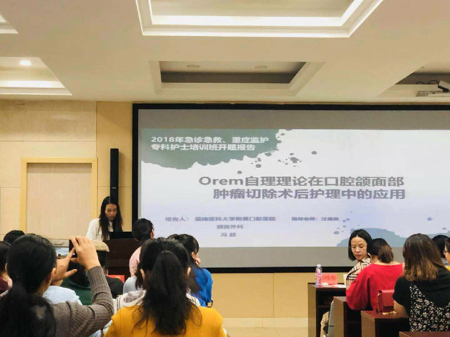 2018年8月6日至10月26日,护理部外派颌面外科冯超护师参加由福建省护理质量控制中心举办的“急诊急救、重症监护专科护士培训班”。经过为期3个月集中式专科理论知识及三甲综合医院急重症医学培训基地技能实践培训,冯超出色完成省护理质量控制中心的考核,并取得了“福建省急诊、急救、危重症专科护士培训合格证书”。培训期间,颌面外科科主任及护士长克服人力的不足,全力支持护理部外派工作,冯超也不负众望,积极努力, 勤学好思,她的《OREM自理理论在口腔颌面部肿瘤切除术后护理中的应用》在全省参加培训的一百三十多名学员中脱颖而出,入选参加本次专科研究开题报告大会交流,结构逻辑慎密,获得一致好评。