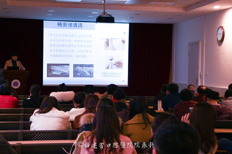 姜醒科长以近期国内的院感事件开始,根据口腔专科医院感染的特点,结合国家及卫生行业在医院感染管理方面最新标准、规范,解读了GB15982《医院消毒卫生标准》、WS/T367《医疗机构消毒技术规范》、WS 310《医院消毒供应中心行业标准》等12个标准规范的部分内容,涵盖了手卫生,物体表面清洁与消毒,医务人员防护用品、隔离技术、手术室和病区院感控制等,重点阐述《口腔器械消毒灭菌技术操作规范》和《口腔门诊院感管理规范》,并指出口腔器械安全是医院感染防控的重中之重,最后总结了口腔感染控制的三要素。精彩详尽的内容,给参加培训的人员留下深刻的印象。