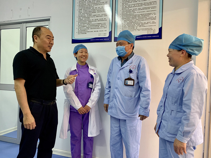 “五一”国际劳动节来临之际,2019年4月30日上午,我院党委书记陈江同志率领行政职能科室负责人到消毒供应室慰问职工,给大家送去诚挚的问候和节日的祝福。陈江书记亲切问候了林高新、阮召钗两位老员工的身体健康状况、生活及工作情况,与他们亲切握手、交谈,对兢兢业业坚守在工作岗位,无私奉献的资深老员工表示由衷的感谢。林高新与阮召钗两位同志同时于2000年3月一起来到福建医科大学附属口腔医院工作,他们在消毒供应室平凡的工作岗位上默默无闻、任劳任怨,一干就是19个年头。19年如一日,林高新同志每日从上午11点连续工作到晚上9点。阮召钗同志每日总是提前到岗,自愿延迟下班。感谢他们无私的付出,为医院和科室的发展做出了不可磨灭的贡献。
