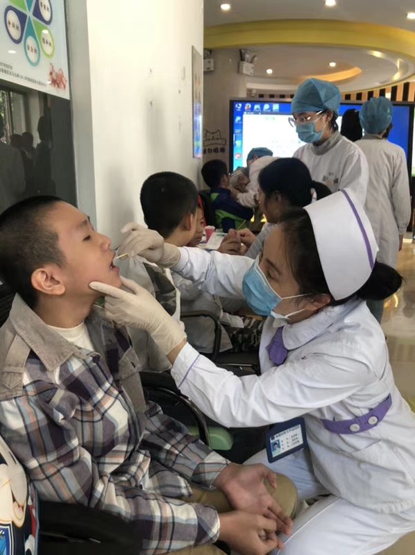 我院自2014年起开展孤残儿童口腔疾病干预项目,牙防志愿者们每年两次的定期检查与跟踪往返于福州市各福利院和康复学校为那里的孩子们的口腔健康保驾护航。我们看着孩子们慢慢长大,看着他们从害怕医生,到老练地自己坐下接受检查,每年都有新的一批孩子加入,他们同样开始和我们慢慢熟悉,周而复始…,他们见证了我们福建牙防人,一直在努力,一起守护他们的口腔健康!(预防科 李威、林烨)