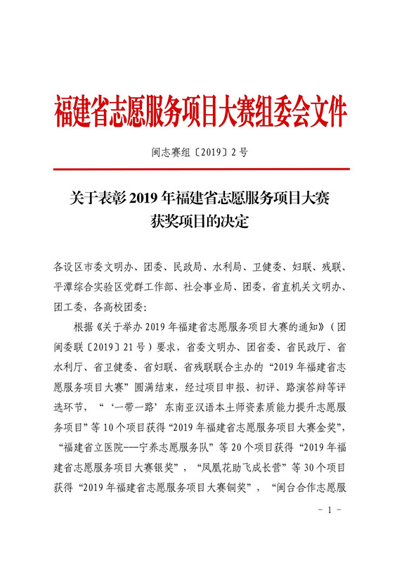 日前,由省委文明办、团省委、省民政厅、省水利厅、省卫健委、省妇联、省残联联合主办的“2019年福建省志愿服务项目大赛”落下帷幕。经项目申报、初评、路演答辩等评选环节,我院团委选送的“微笑快车进社区”项目喜获铜奖。
