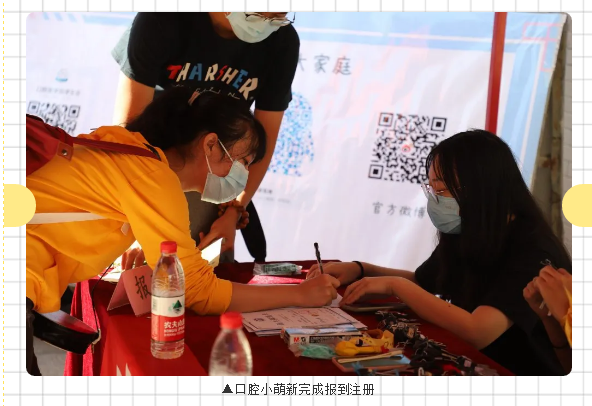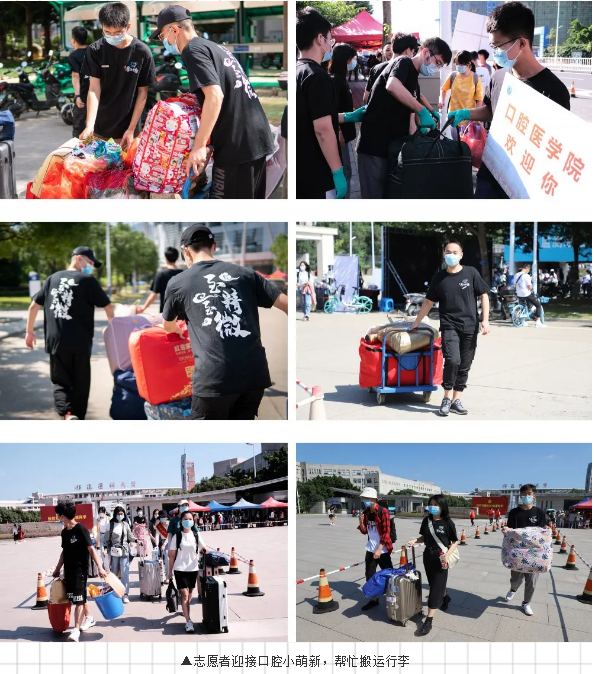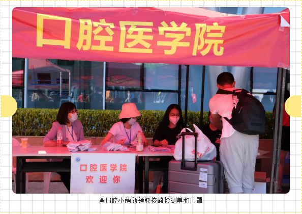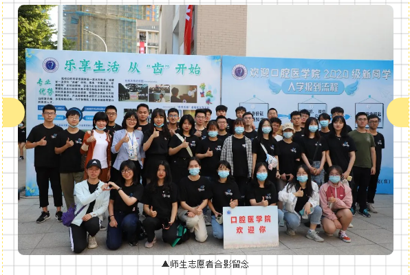 我院营造了温馨、传承、友爱的迎新氛围,沿途布置指示牌,报到注册点布置了“乐享生活,从‘齿’开始”学院风采介绍以及“欢迎2020级新同学”、报到注册流程等宣传展板,新生所在宿舍楼外悬挂了“宝剑锋从磨砺出,梅花香自苦寒来” “齐心抗疫同担青年使命,盛情迎新共谱口院新章”横幅,楼梯口粘贴了“欢迎口腔2020级新生回家”指示牌,配上萌芽的图案,呈现出热情、温馨的迎新氛围,使2020级新生感受到学院的关爱与温暖。设置了迎新咨询点、核酸检测单领取点、行李寄存点、报到注册点和志愿服务点,通过辅导员、党员、助导和志愿者们点对点服务,实时掌握新生动态,为新生提供行李搬运、引导和咨询等各项服务。学院的“用心服务”为新生们上了大学第一课,引导新生们明白学医生涯中“用心服务”的重要性。