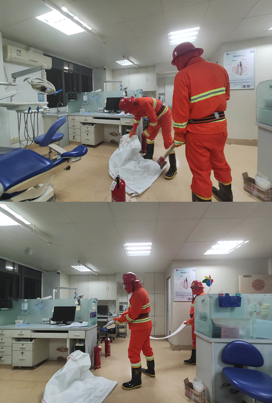 演练模拟设置为医院门诊二楼黏膜科3号椅位突发火情,医护人员发现火情后立即启动一键报警并利用灭火器开展初期火灾的扑救。科主任及护士长快速指挥医护人员协助患者撤离,只见大家用湿纸巾捂住口鼻,弯腰、有序地按疏散路线疏散到安全地点。保卫处接到火情后5分钟之内启动应急预案,并迅速呼叫义务消防员赶到现场进行救援。演练中,医生、护士、患者及安保人员都快速行动,各司其职,各个环节有条不紊,达到了快速、准确、成功的消防演练目的。