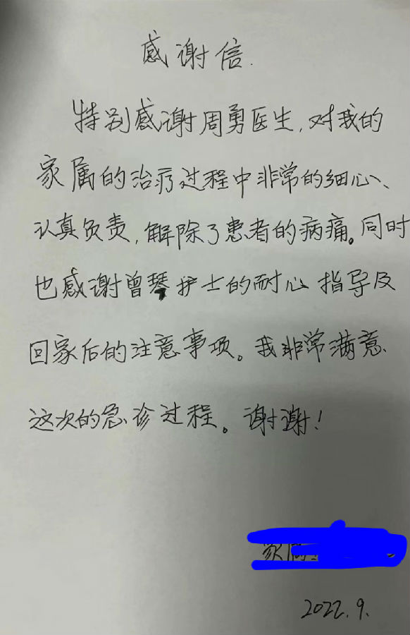患者拔牙后2天伤口突然出血,无法止住。患者惊恐不安,家属担心不已,遂来到我院急诊科求诊。当班急诊医生种植科周勇及急诊护士特诊科曾琴进行了接诊。在及时安抚了患者及家属后,周勇医生详细地了解了患者的病情,并进行了细致的检查。在找到出血位置后,周勇医生为患者进行了局麻下的缝合止血,成功地解决了患者的病痛。曾琴护士还对患者和家属进行注意事项的的耐心指导和宣教。患者和家属很是感激,于是手书感谢信一封表示谢意。