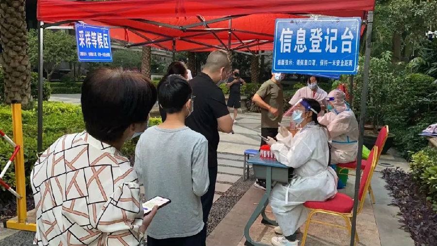 到达指定采样点后,核酸采样突击队员们熟练地穿上防护服,戴上手套、面罩,克服穿着防护服的不便与闷热,迅速投入战斗。早一分钟,便能让排队的群众少等一会,这就是大家的共识。