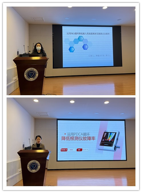 在此次的专项汇报会上,共有两项护理持续改进项目,分别是牙体牙髓科的《运用PDCA循环降低根测仪故障率》、种植治疗室的《运用PDCA循环降低高值耗材交接清点错误率》。这两个护理单元分别从选题背景、拟定计划、项目开展、项目成效等方面进行了汇报,通过用图文并茂的PPT演示及利用雷达图、甘特图、鱼骨图等多种管理工具的使用,紧密结合临床实际工作,展示了经过一系列改善措施后,降低了不良事件的发生率,真正做到了利用护理质量管理工具促进护理问题的改善。